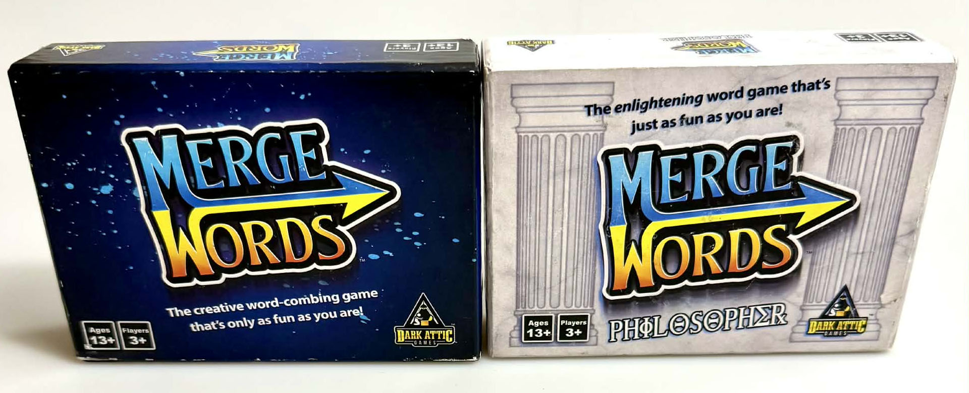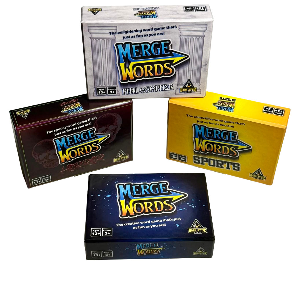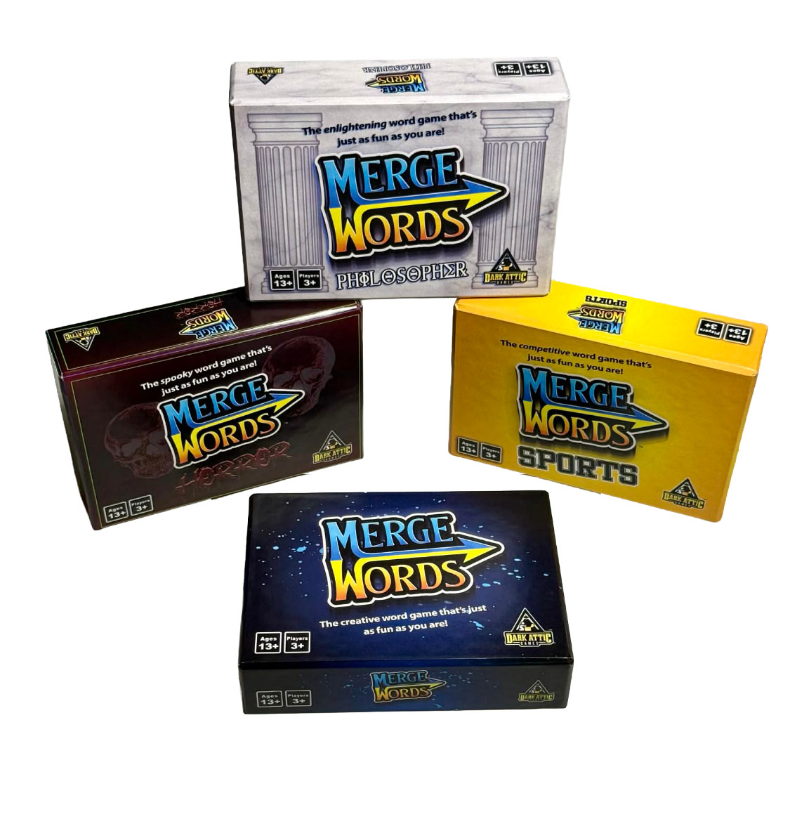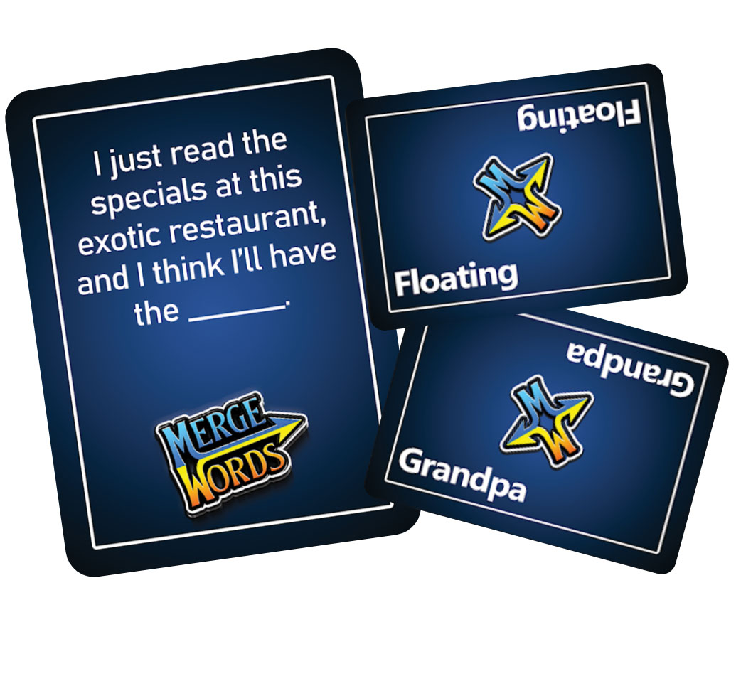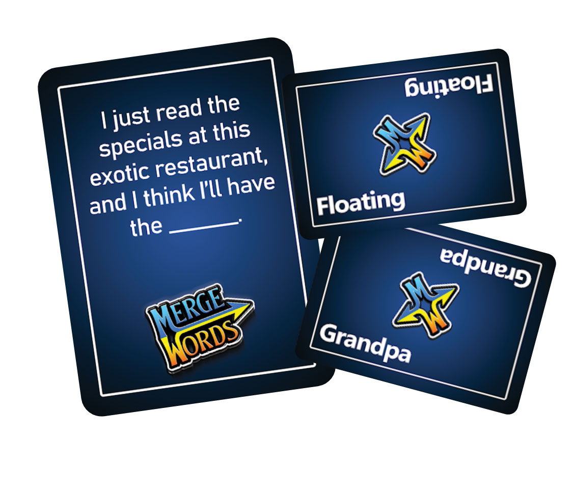 With the 4 different versions and the additional themed packs, there are tons of possible card combos and modes for gameplay variations. The creativity comes from players creating MergeWords, and the "Choosider," who decides which funny (or outrageous) criteria that players use to build their MergeWords.